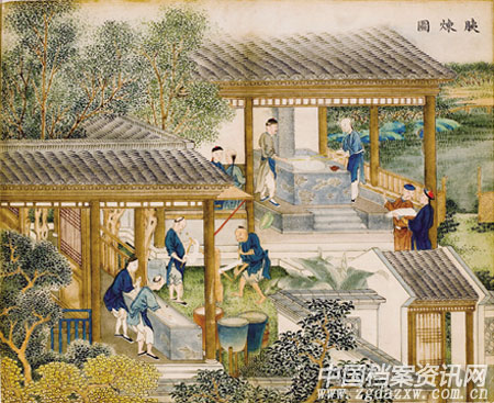 《丝织十景图》中出现了60多个人物,为清一色的男性。这些男性主要是从事丝织业生产的操作工,画面上偶尔出现头戴红顶帽的,则是官府所派的管理人员。第一幅《胰炼图》中有一个工人抱着一捆丝向管理人员汇报事情。第三幅《络丝图》里有一名官员模样的人向管理人员“训话”。