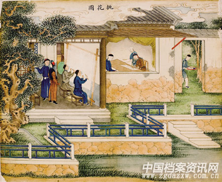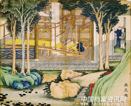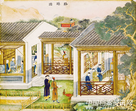 《丝织十景图》所描绘的丝织场所房屋宽敞,花木、湖石、远山点缀其间,增加了画面的美感,使其作为现实主义作品的同时,又具有艺术的感染力。